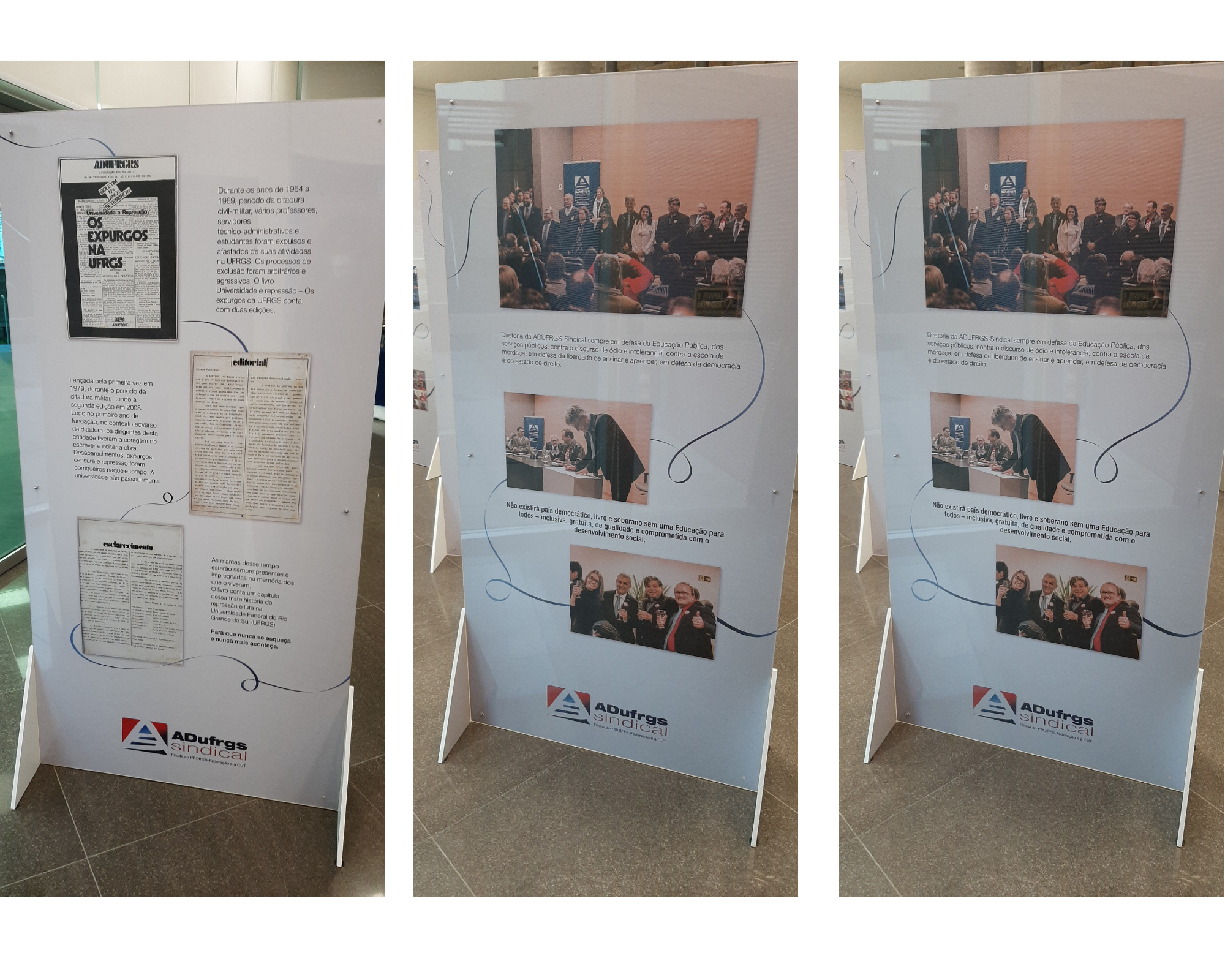 O documento e demais fotos distribuídas em seis expositores retratam a trajetória da associação, que iniciou durante a luta pela democratização do País e da Universidade e, em 2008, foi transformada em ADUFRGS-Sindical. Hoje, a entidade representa os docentes das Instituições Federais de Ensino Superior do Rio Grande do Sul, em 11 municípios. A exposição fotográfica, que irá até o dia 24 de junho na sede social, abriu a programação do mês de aniversário do sindicato.