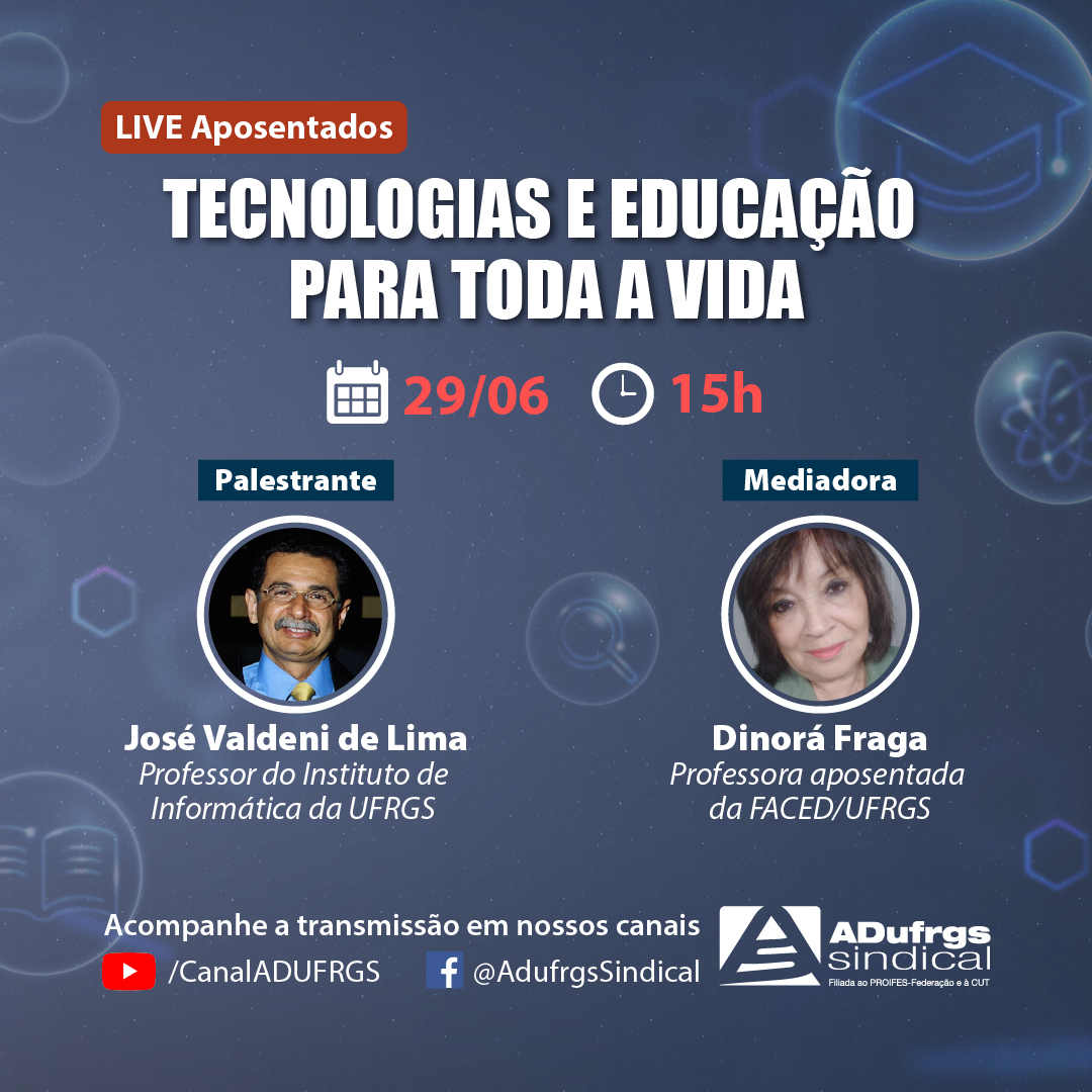 Desta vez com o tema “Tecnologias e Educação para Toda a Vida”, que será abordado por José Valdeni de Lima, professor do Instituto de Informática e do Centro Interdisciplinar de Novas Tecnologias na Educação (CINTED) da Universidade Federal do Rio Grande do Sul. A mediação será conduzida pela professora aposentada Dinorá Fraga, da Faculdade de Educação da UFRGS. O encontro é promovido pelo Núcleo de Multiatividades do sindicato, coordenado pela professora aposentada Graciela Quijano.