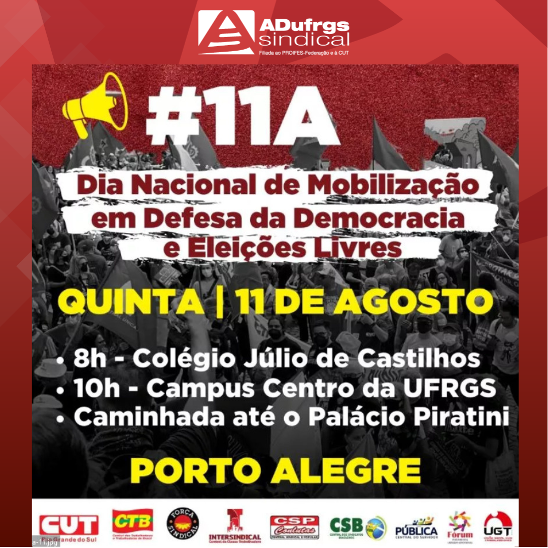 A ADUFRGS-Sindical espera todos os filiados e filiados no ato desta quinta-feira, 11, em Porto Alegre, para defender a democracia, o sistema eleitoral brasileiro e eleições livres, marcando o dia nacional de mobilização convocado por movimentos estudantis, centrais sindicais, movimentos populares e entidades da sociedade civil. Na ocasião, a entidade também assina a “Carta às Brasileiras e aos Brasileiros em defesa do Estado Democrático de Direito”.