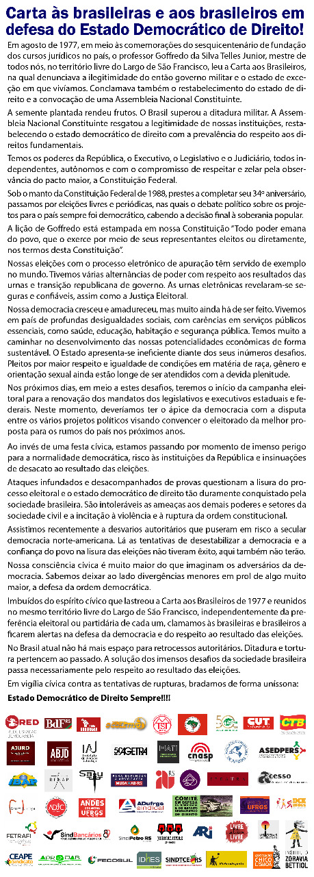 A concentração começou às 8h, em frente ao Colégio Estadual Júlio de Castilhos, o Julinho, no bairro Azenha. Depois os manifestantes foram em marcha até o Campus Centro da UFRGS, e, às 11h, foi lida a “Carta às Brasileiras e aos Brasileiros em defesa do Estado Democrático de Direito”, de forma simultânea com outros atos por todo o país. O texto elaborado pela Faculdade de Direito da Universidade de São Paulo (USP) já ultrapassou as 800 mil assinaturas. (Assista a leitura da carta aqui, no Instagram da ADUFRGS, e confira o texto ao final desta matéria).