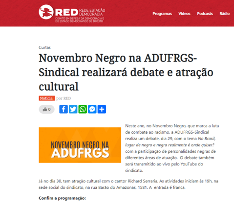 Neste ano, no Novembro Negro, que marca a luta de combate ao racismo, a ADUFRGS-Sindical realiza um debate, dia 29, com o tema No Brasil, lugar de negro e negra realmente é onde quiser? com a participação de personalidades negras de diferentes áreas de atuação. O debate também será transmitido ao vivo pelo YouTube do sindicato.