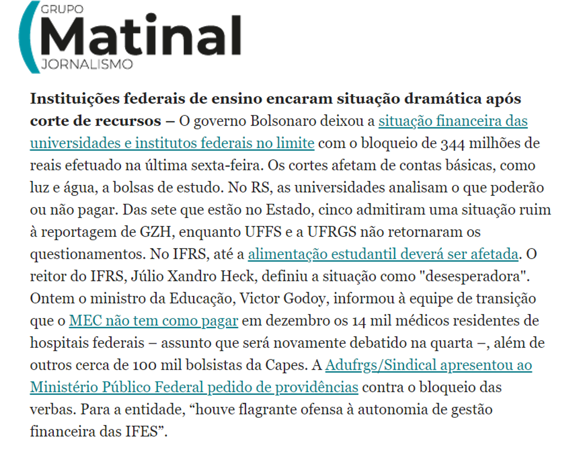 O governo Bolsonaro deixou a situação financeira das universidades e institutos federais no limite com o bloqueio de 344 milhões de reais efetuado na última sexta-feira. Os cortes afetam de contas básicas, como luz e água, a bolsas de estudo. No RS, as universidades analisam o que poderão ou não pagar. Das sete que estão no Estado, cinco admitiram uma situação ruim à reportagem de GZH, enquanto UFFS e a UFRGS não retornaram os questionamentos. No IFRS, até a alimentação estudantil deverá ser afetada. O reitor do IFRS, Júlio Xandro Heck, definiu a situação como “desesperadora”. Ontem o ministro da Educação, Victor Godoy, informou à equipe de transição que o MEC não tem como pagar em dezembro os 14 mil médicos residentes de hospitais federais – assunto que será novamente debatido na quarta –, além de outros cerca de 100 mil bolsistas da Capes. A Adufrgs/Sindical apresentou ao Ministério Público Federal pedido de providências contra o bloqueio das verbas. Para a entidade, “houve flagrante ofensa à autonomia de gestão financeira das IFES”.