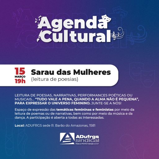 Na sequência da agenda cultural 2023 com destaque para o Mês da Mulher, no dia 15 de março, às 19h, acontece o Sarau das Mulheres com leitura de textos e poesias.