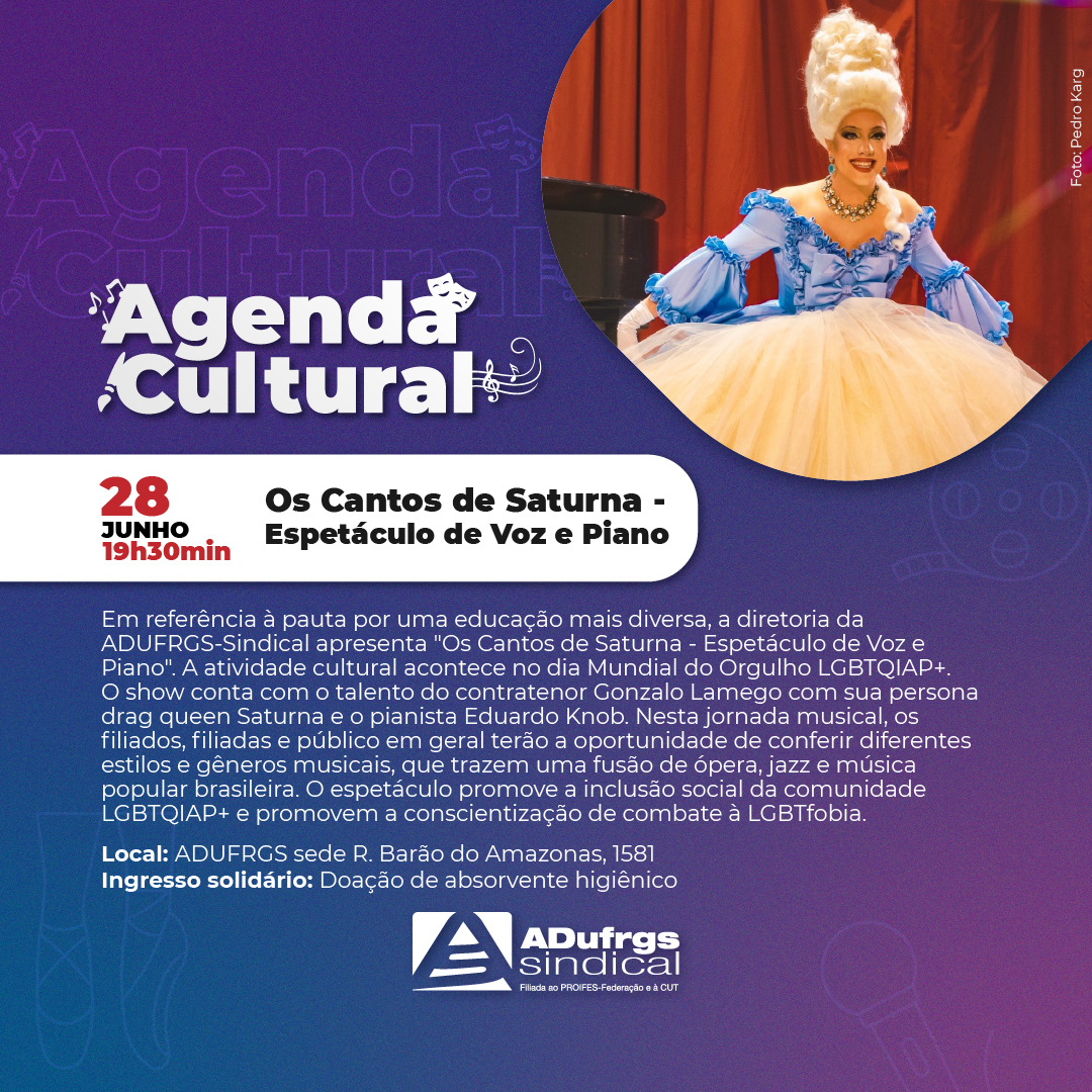 Em referência à pauta por uma educação mais diversa, a diretoria da ADUFRGS-Sindical apresenta “Os Cantos de Saturna – Espetáculo de Voz e Piano”, dia 28 de junho, às 19h30min, no auditório do Sindicato. A atividade cultural acontece no dia Mundial do Orgulho LGBTQIAP+.