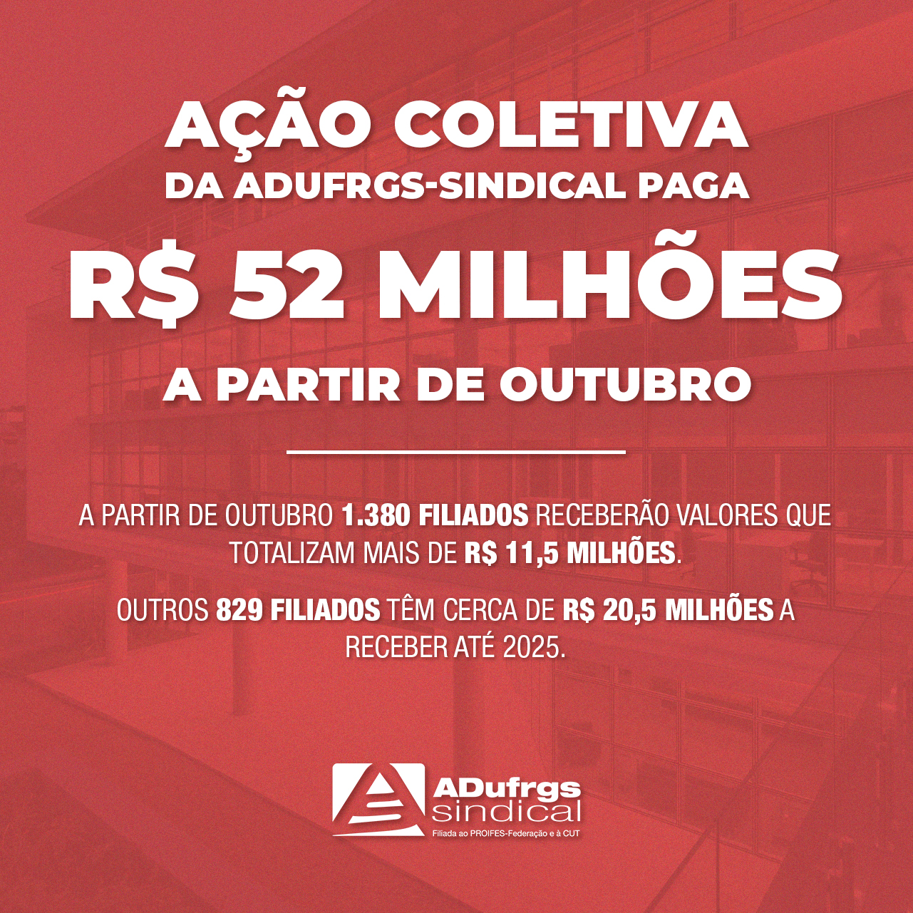 A ADUFRGS-Sindical informa que a partir de outubro 1.380 filiados receberão valores que totalizam mais de R$ 11,5 milhões referentes à ação coletiva dos 3,17%. Outros 829 filiados têm cerca de R$ 20,5 milhões a receber até 2025. Por tratar-se de ação coletiva, há também não filiados beneficiados, porém estes devem arcar com diferentes custos. No total, são R$ 52 milhões a serem pagos.