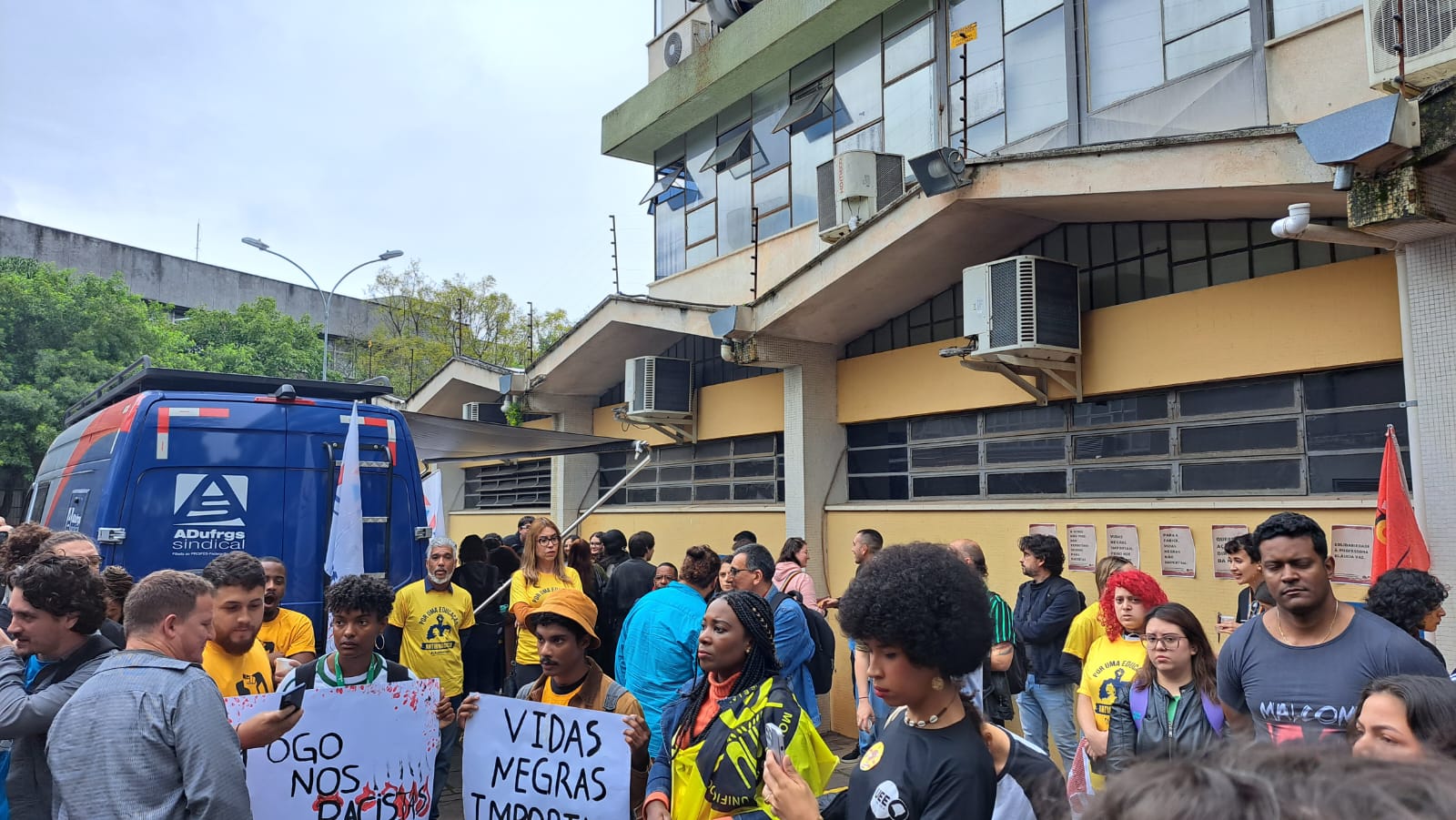 O episódio racista foi motivo de repúdio por parte de docentes, estudantes, servidores da UFRGS, parlamentares e entidades representativas como a ADUFRGS-Sindical, que se uniram em um ato público realizado na manhã de hoje, em frente à FABICO UFRGS.