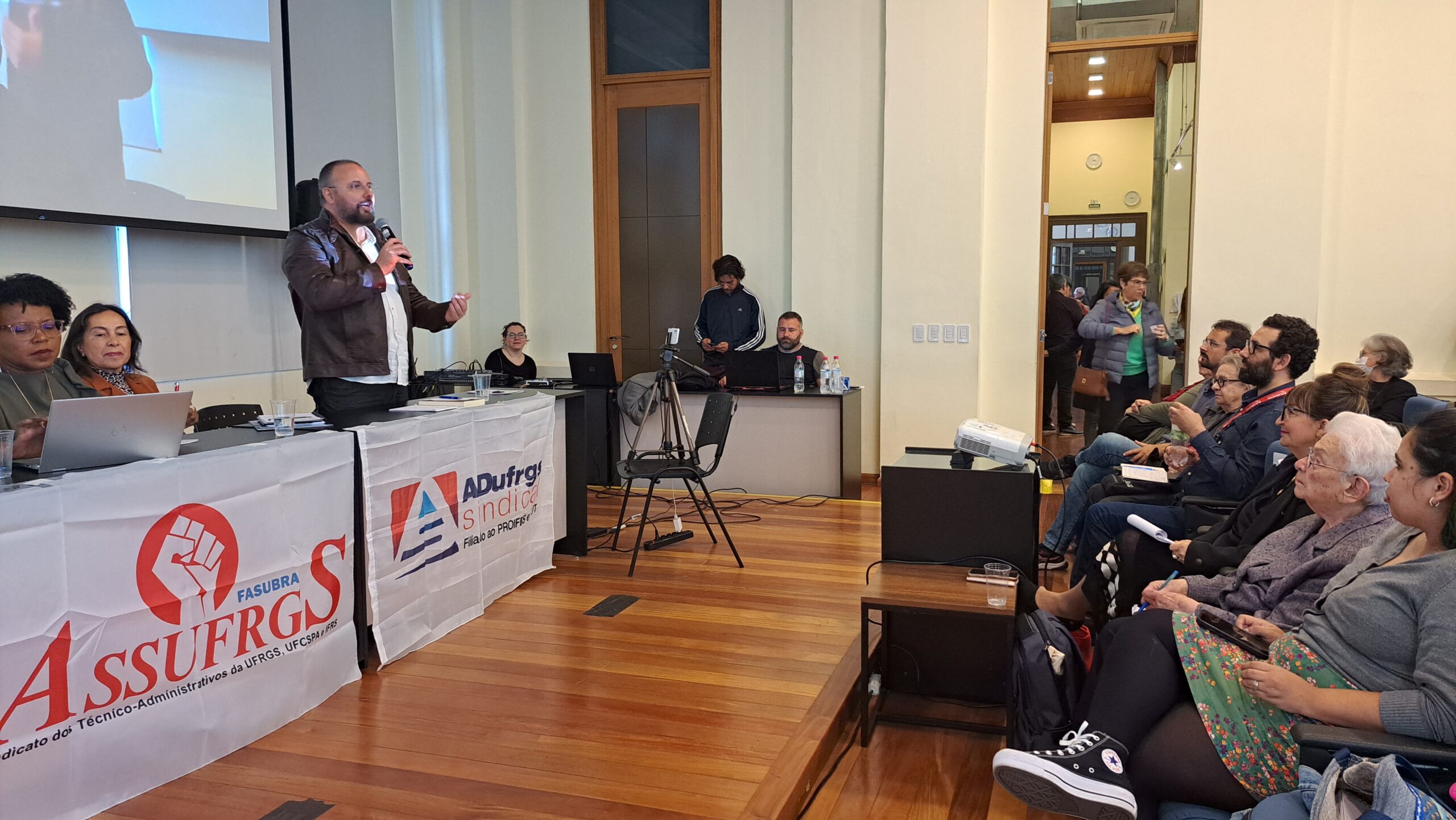 A mesa trouxe Jackson Raymundo, da Secretaria de Educação Superior do Ministério da Educação (SESU/MEC), e Sônia Ogiba, coordenadora do Fórum Municipal de Educação de Porto Alegre (FME-POA). A professora representa a ADUFRGS no fórum.