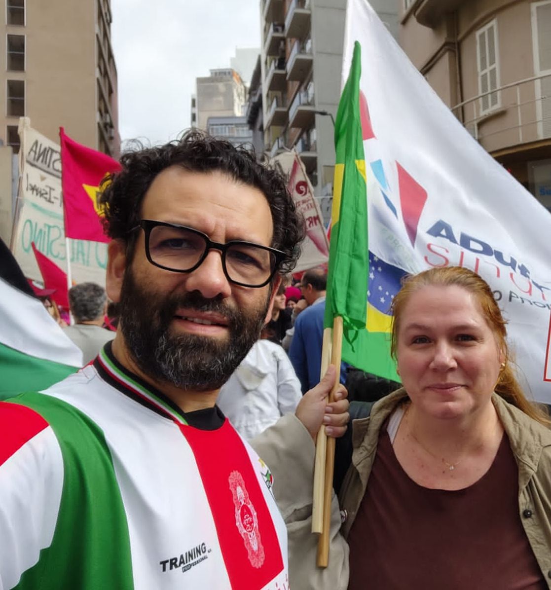 A ADUFRGS-Sindical participou no sábado, 4, da marcha pelo Dia Mundial de Solidariedade ao Povo Palestino. Porto Alegre foi uma das pelo menos 13 cidades de todas as regiões do país a realizar protestos, marchas e seminários, juntamente com outras 100 cidades ao redor do mundo, como Washington (EUA), Buenos Aires (Argentina), Dublin (Irlanda), Londres (Inglaterra), Paris (França) e Berlin (Alemanha). A mobilização foi convocada durante a 3ª Conferência Internacional Dilemas da Humanidade, realizada em outubro, na África do Sul, pela Assembleia Internacional dos Povos (AIP). A vice-presidente Ana Boff de Godoy, e o diretor de Assuntos da Carreira do Ensino Básico, Técnico e Tecnológico (EBTT), Roger Sauandaj Elias, representaram o Sindicato.