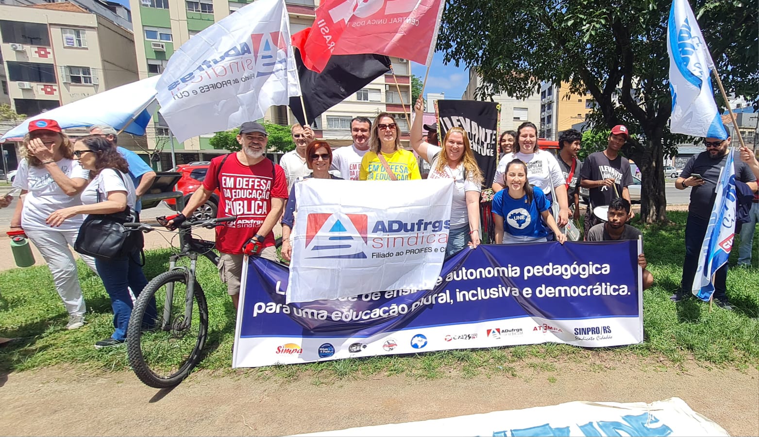 A ADUFRGS-Sindical participou no domingo, 19, pela manhã, do Ato pela Liberdade de Ensinar e Aprender, em parceria com outros sindicatos e organizações representativos dos professores e da educação. Os manifestantes saíram em caminhada pelo Brique da Redenção, a partir do Monumento ao Expedicionário, em resposta ao crescente número de casos de perseguição ideológica contra docentes nas escolas privadas e públicas no Rio Grande do Sul e no país. O Sindicato foi representado pela vice-presidente Ana Boff de Godoy, a diretora de Secretaria Regina Witt e os diretores Paulo Xavier, 2º Tesoureiro e Diretor de Assuntos Jurídicos, e Cristina Martins, diretora de Relações Sindicais.