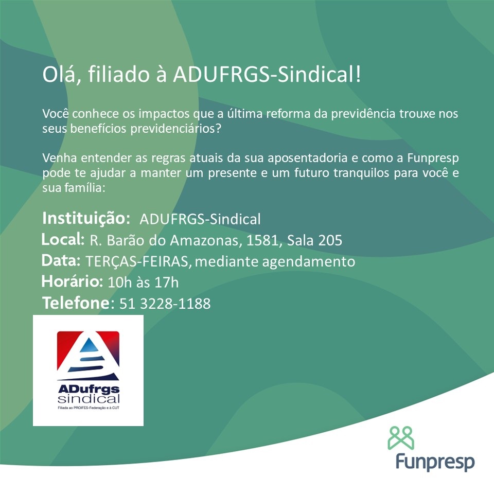 A partir de 28 de novembro os filiados da ADUFRGS-Sindical passam a contar, todas as terças-feiras, das 10h às 17h, com um horário para tirar dúvidas sobre aposentadoria, reforma da previdência, benefícios previdenciários e todas as regras atuais em torno do tema. Entre em contato pelo fone (51) 3228-1188 e agende seu atendimento na sede do Sindicato com consultores da Fundação de Previdência Complementar do Servidor Público Federal do Poder Executivo (Funpresp).