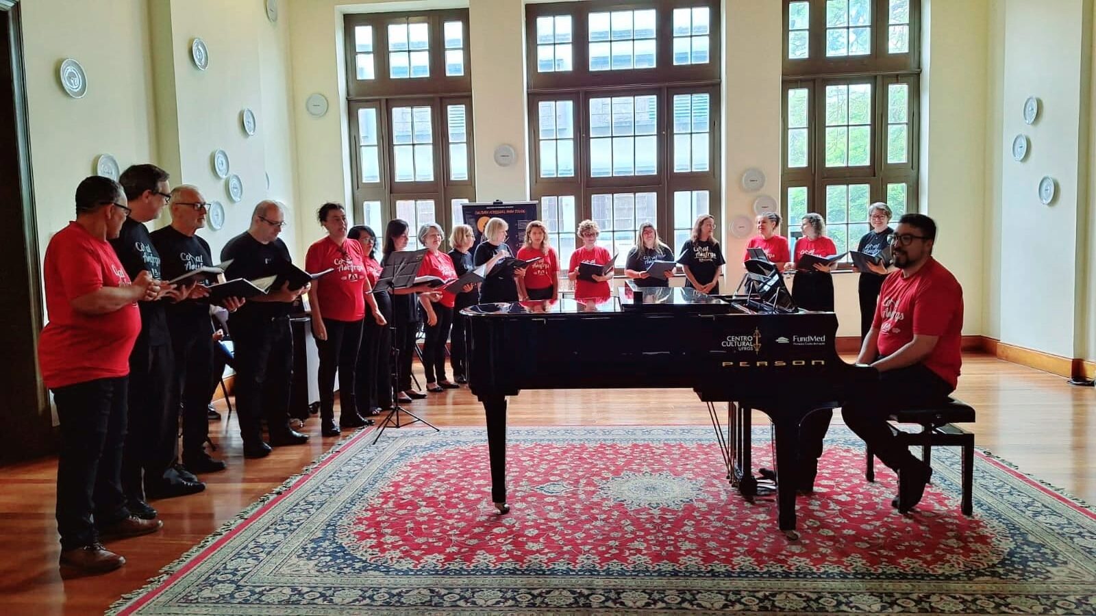 O Coral ADUFRGS foi atração do 24° Dia da Doação da Universidade Federal do Rio Grande do Sul, na manhã desta quinta-feira, 7, no Espaço Figueira do Centro Cultural da UFRGS. A iniciativa convidou a comunidade a doar recursos destinados à preservação dos prédios históricos da Universidade.