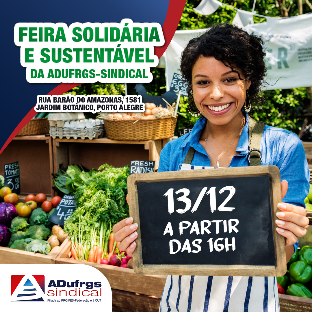 Na próxima quarta-feira, 13, a ADUFRGS-Sindical realiza mais uma edição da Feira Solidária Sustentável, a partir das 16h, na sede da Barão do Amazonas, 1581. É uma oportunidade para você adquirir produtos naturais, orgânicos e agroecológicos que incluem alimentos, vestuário, cosméticos, além de peças de artesanato. Aproveite!