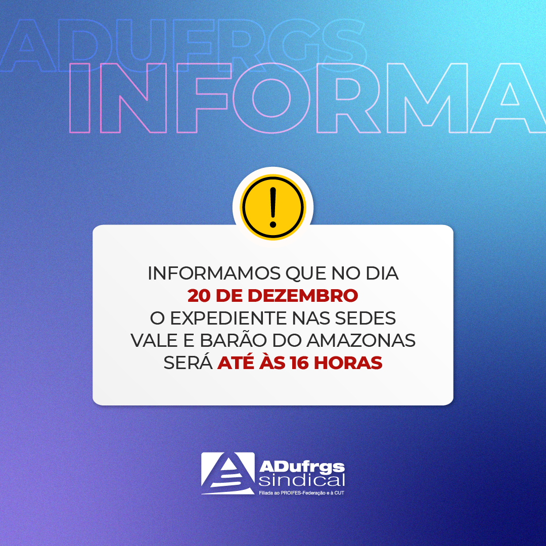 Informamos que no dia 20 de dezembro o expediente nas sedes Vale e Barão do Amazonas será até às 16h.