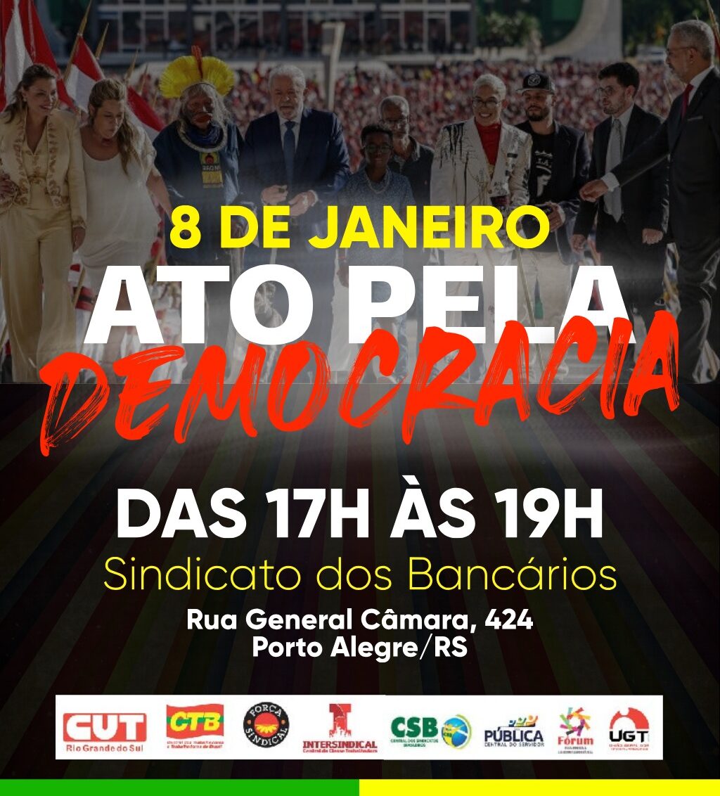 Em Porto Alegre, o evento organizado por CUT-RS e lideranças locais acontece no Sindbancários, das 17h às 19h. Sindicatos, políticos, movimentos e órgãos jurídicos do estado, como o ex-governador Tarso Genro e o Tribunal Regional do Trabalho da 4ª região, estarão reunidos para lembrar à sociedade de que não podemos tolerar ações como a de 8 de janeiro de 2023, que foi uma das piores demonstrações de desrespeito à democracia brasileira.