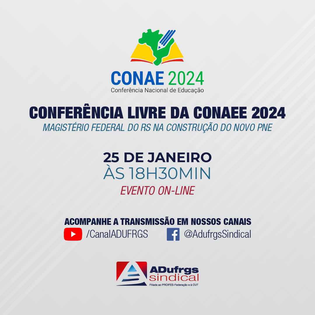 Nesta quinta-feira, 25, às 18h30min, a ADUFRGS-Sindical realiza, em formato on-line, a Conferência Livre “Magistério Federal do RS na construção do novo PNE” [Plano Nacional de Educação], como parte das atividades que antecedem a Conferência Nacional Extraordinária de Educação (CONAEE) edição 2024, que será realizada em Brasília, de 28 a 30 de janeiro. A transmissão da atividade do dia 25 organizada pela ADUFRGS será feita pelo YouTube (abaixo) e Facebook (aqui) do Sindicato.