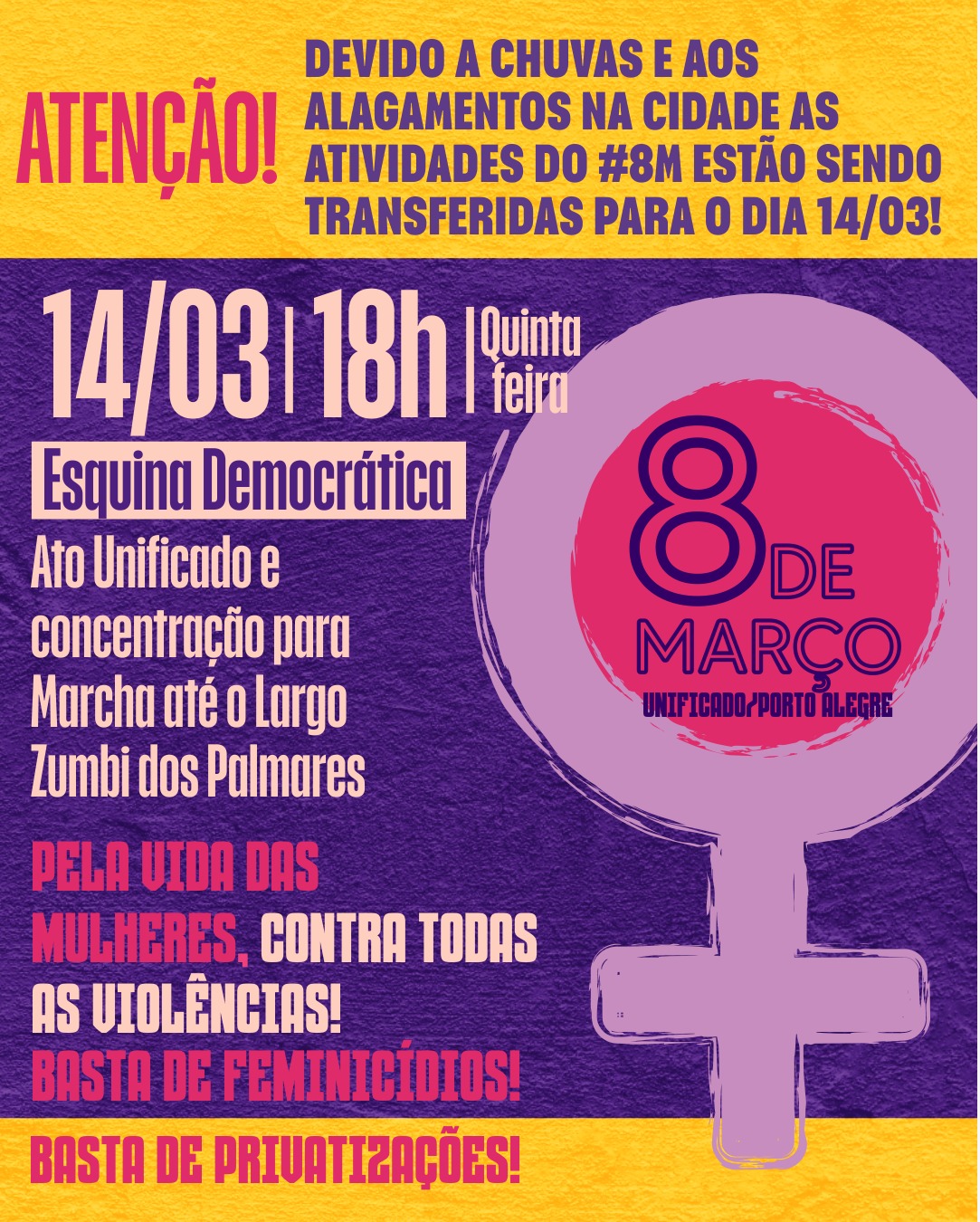 A ADUFRGS-Sindical informa que o “8 de Março Unificado”, organizado pelo coletivo de mulheres da CUT/RS e demais centrais, foi transferido para o dia 14 de março, com concentração às 18h, na Esquina Democrática. Depois, as mulheres seguem em marcha até o Largo Zumbi do Palmares.