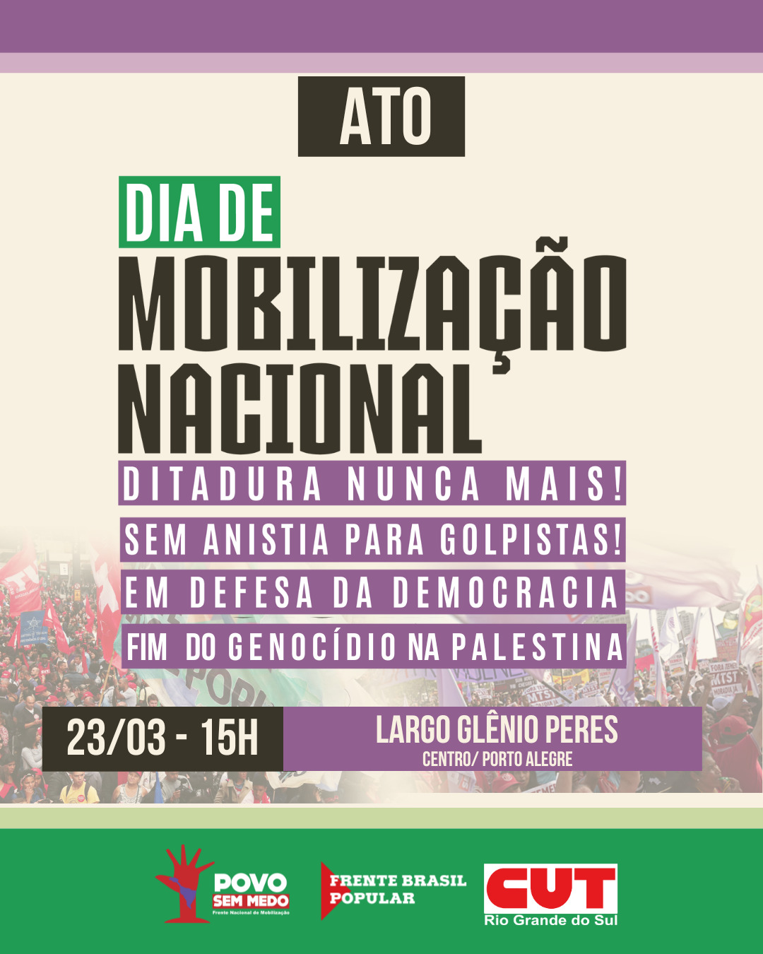 A ADUFRGS-Sindical, ao longo dos seus mais de 45 anos, tem como uma de suas principais bandeiras a defesa da democracia. No próximo sábado, 23, às 15h, junte-se à ADUFRGS no Largo Glênio Peres para o Dia de Mobilização Nacional contra a ditadura e a anistia para golpistas. Venha defender a democracia!
