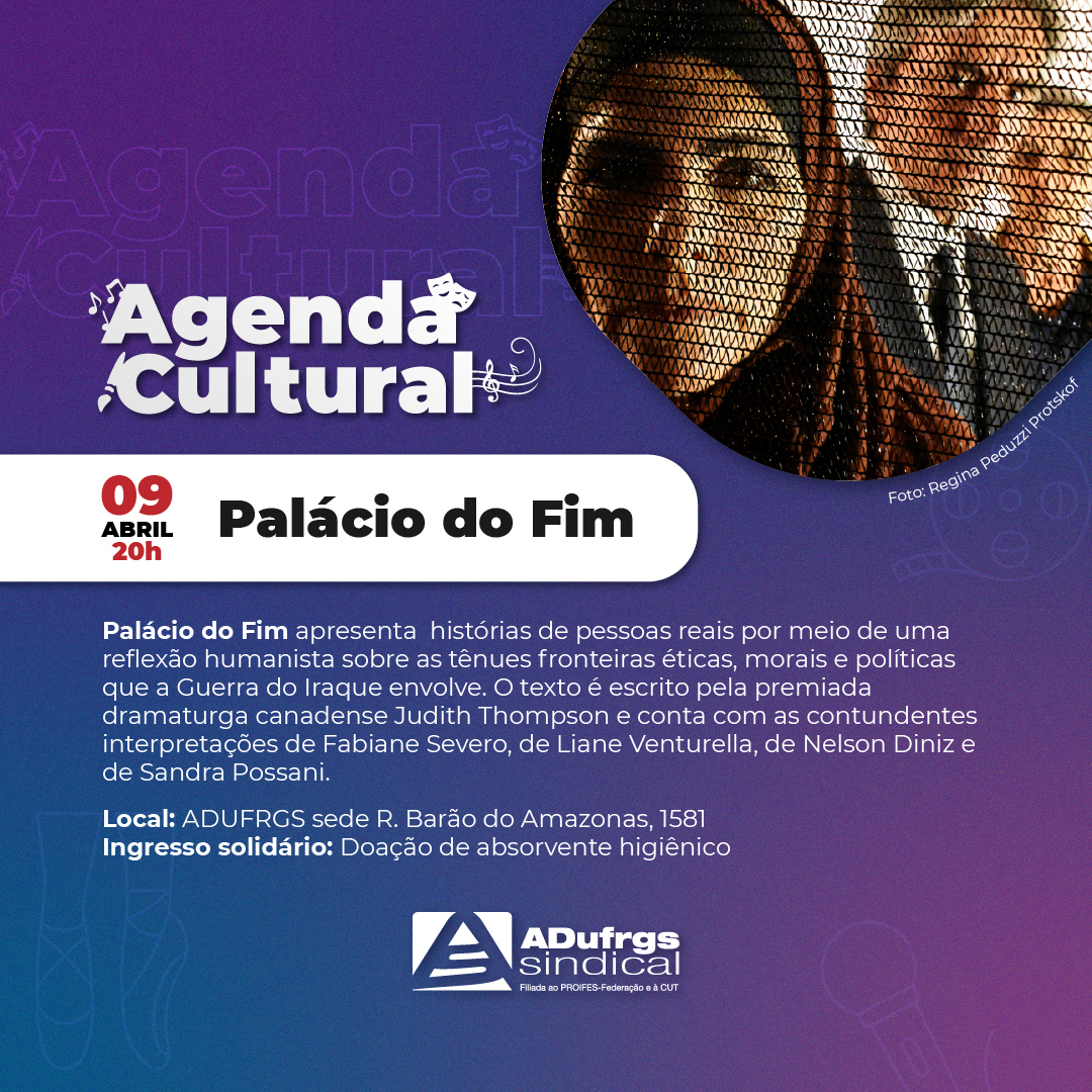A Agenda Cultural da ADUFRGS-Sindical retorna no dia 9 de abril, às 20h, com o espetáculo “Palácio do Fim”. O evento é aberto ao público, mediante inscrições prévias e ingresso solidário de doação de um pacote de absorvente higiênico.