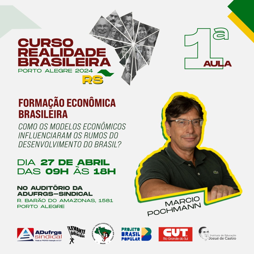 No dia 27 de abril, das 9h às 18h, acontece a primeira aula do Curso Realidade Brasileira (CRB), promovido pela ADUFRGS-Sindical, que une forças de diversos movimentos populares como o Movimento dos Trabalhadores Sem Terra (MST), Movimento Brasil Popular (MBP), Comitês Populares, Levante Popular da Juventude e CUT/RS.