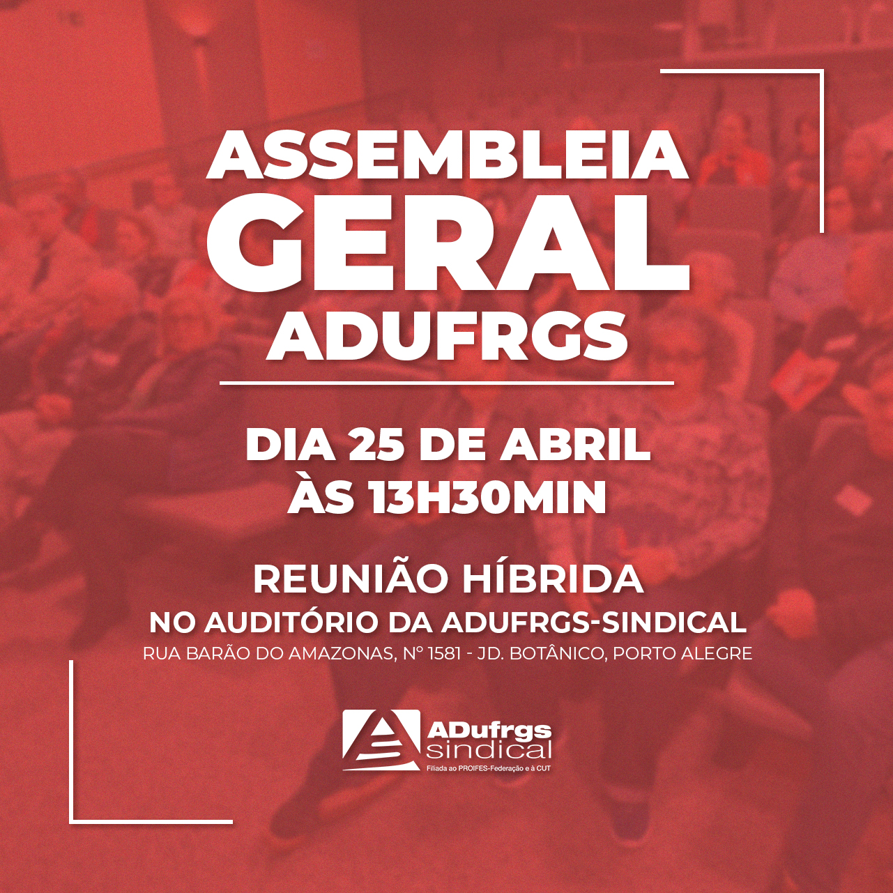 Nesta quinta-feira, 25, às 13h30, a ADUFRGS-Sindical realiza Assembleia Geral Extraordinária em formato híbrido pela plataforma Zoom Cloud Meetings e presencial no auditório da ADUFRGS- Sindical (Rua Barão do Amazonas, 1581 – Jardim Botânico).