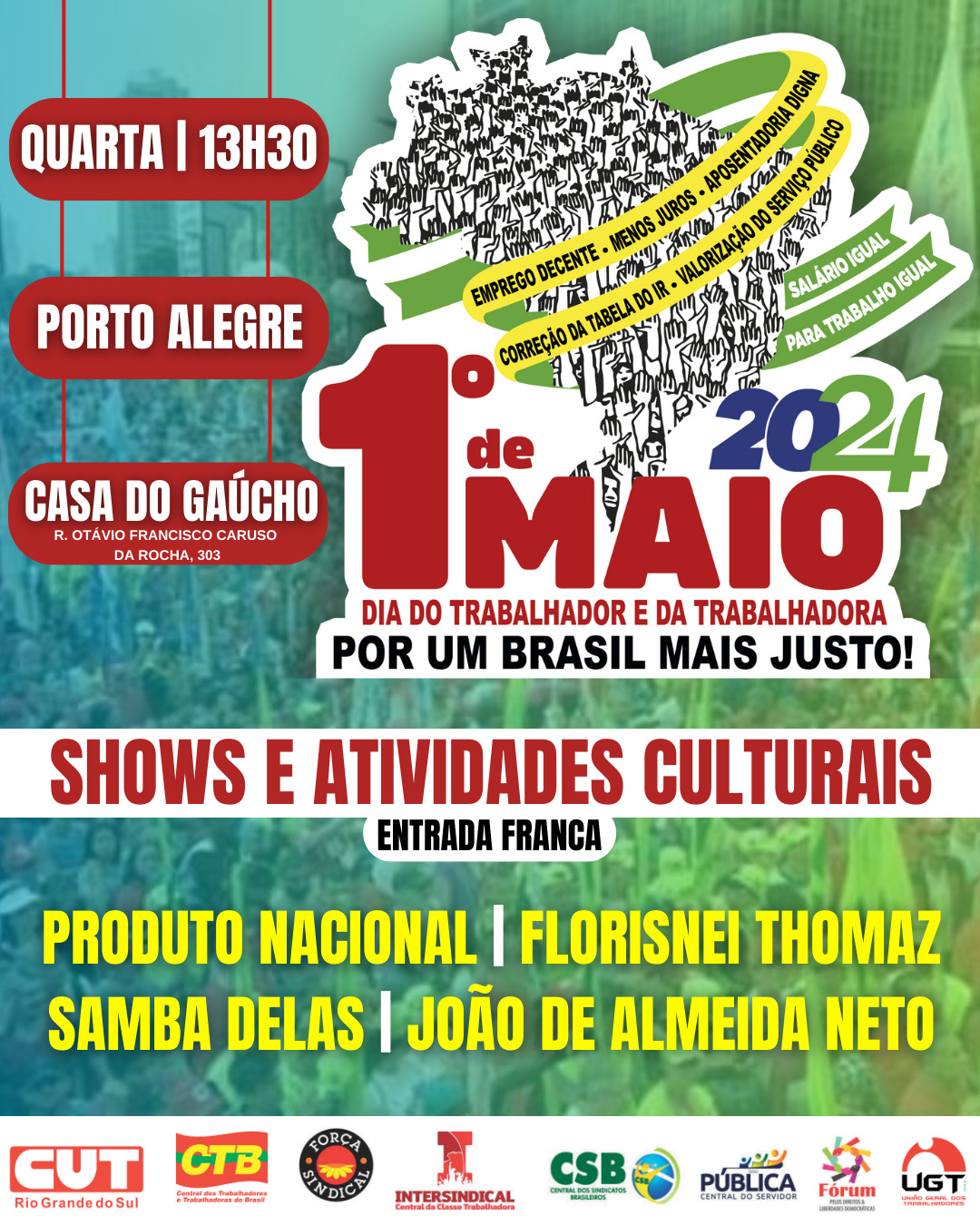 A CUT-RS e as centrais sindicais do Rio Grande do Sul celebram no 1° de Maio (quarta), o dia do trabalhador e da trabalhadora, promovendo um ato unificado, com shows culturais e convidados especiais.