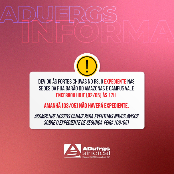 A ADUFRGS-Sindical informa seus filiados e filiadas que, devido às fortes chuvas no Rio Grande do Sul, o expediente foi encerrado às 17h desta quinta-feira, 2 de maio, nas sedes da rua Barão do Amazonas e Campus Vale.