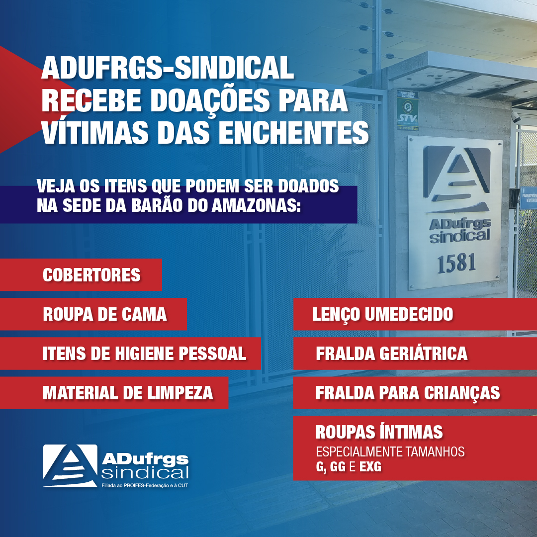 A sede da ADUFRGS-Sindical na rua Barão do Amazonas, 1581, passa a ser ponto de coleta de doações (veja abaixo quais itens podem ser doados) e produção e envio de mantimentos prontos. Excepcionalmente, os atendimentos jurídicos e todas as atividades como pilates, alongamento, coral, xadrez, estão suspensas, assim como o atendimento na sede no Campus Vale. No final de semana já foram feitas as primeiras doações (veja aqui).