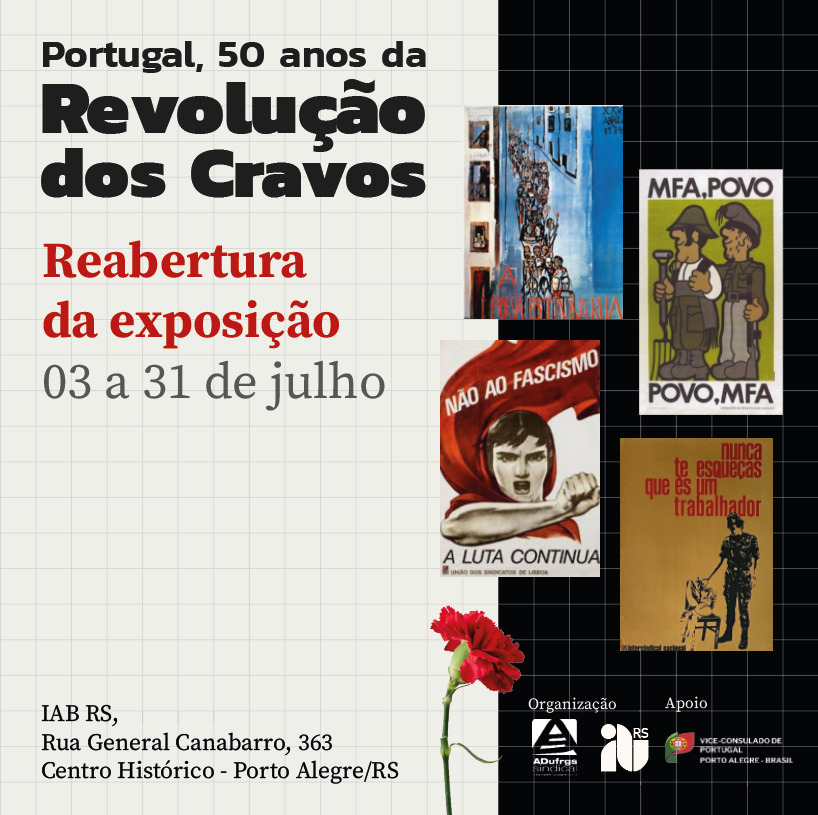 Para marcar a data, o IAB RS e a ADUFRGS Sindical com apoio do Consulado de Portugal, inauguraram uma exposição onde se apresenta uma coleção particular de cartazes alusivos à Revolução dos Cravos. O acervo, gentilmente cedido pela Arq. Daniela Fialho, retrata esse momento único da história. Também se exibe em projeção, fotos de Daniel de Andrade Simões feitas na época do 25 de abril.