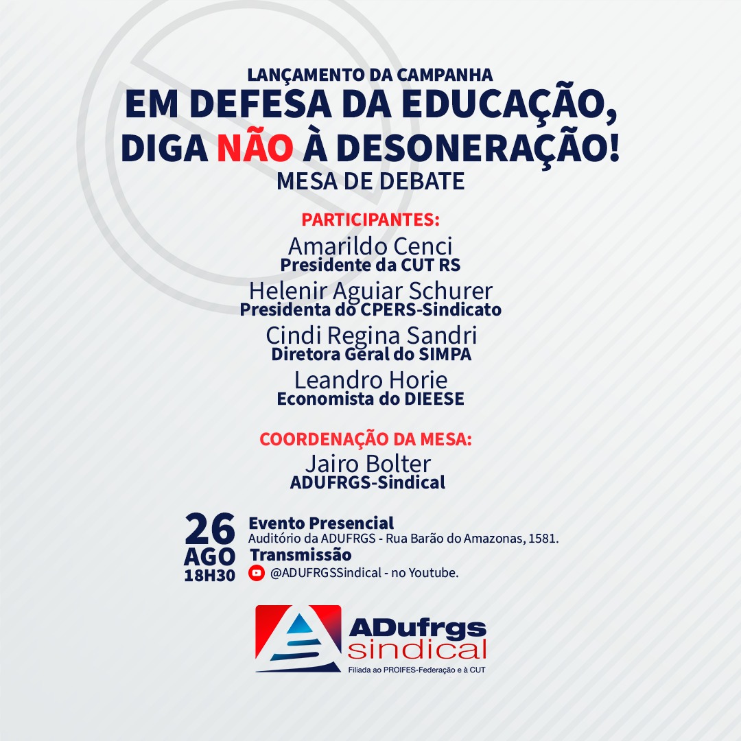 Na próxima segunda-feira, 26 de agosto, às 18h30min, será realizado o lançamento da campanha “Em defesa da educação, diga NÃO à desoneração”. O evento inclui uma mesa de debate com o presidente da CUT RS, Amarildo Cenci, a presidenta do CPERS-Sindicato, Helenir Aguiar Schürer, a diretora-geral do Sindicato dos Municipários de Porto Alegre (Simpa), Cindi Regina Sandri, o economista Leandro Horie, do Departamento Intersindical de Estatística e Estudos Socioeconômicos (DIEESE), e coordenação do presidente da ADUFRGS-Sindical, professor Jairo Bolter.