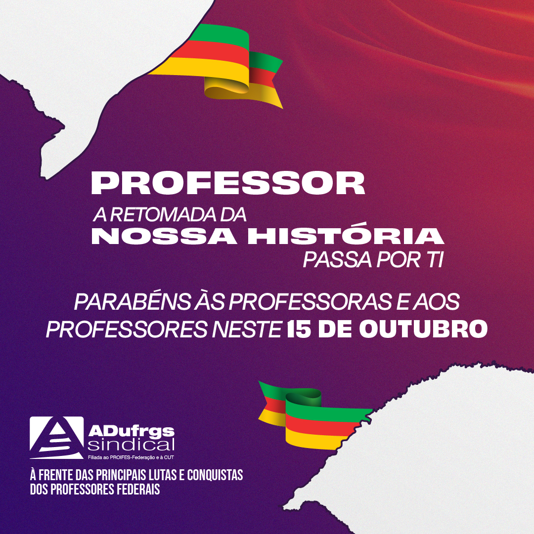 Neste dia 15 de outubro, a ADUFRGS-Sindical presta a sua homenagem às professoras e aos professores que são protagonistas em sua luta, e reitera o seu orgulho de ser o Sindicato de maior representatividade dos docentes federais do Sul do Brasil.