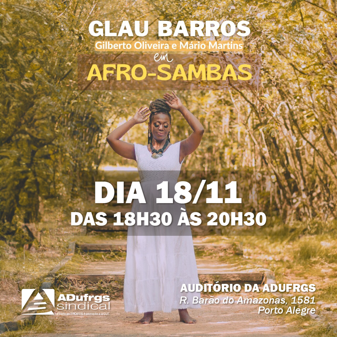 Neste Novembro Negro, que marca a luta de combate ao racismo estrutural e por uma educação antirracista, a ADUFRGS-Sindical convida para o espetáculo “Afro Sambas”, com Glau Barros, Gilberto Oliveira e Mário Martins, no dia 18 de novembro, no auditório da sua sede na rua Barão do Amazonas, 1581, bairro Jardim Botânico. A atividade tem início às 18h30min, com mesa receptiva (coffee break), e o espetáculo inicia às 19h30min, com encerramento previsto para às 20h30min. O evento é aberto a filiados e comunidade em geral, com entrada franca e registro de presença por este link. É possível fazer a inscrição até na hora do evento, havendo lugares.