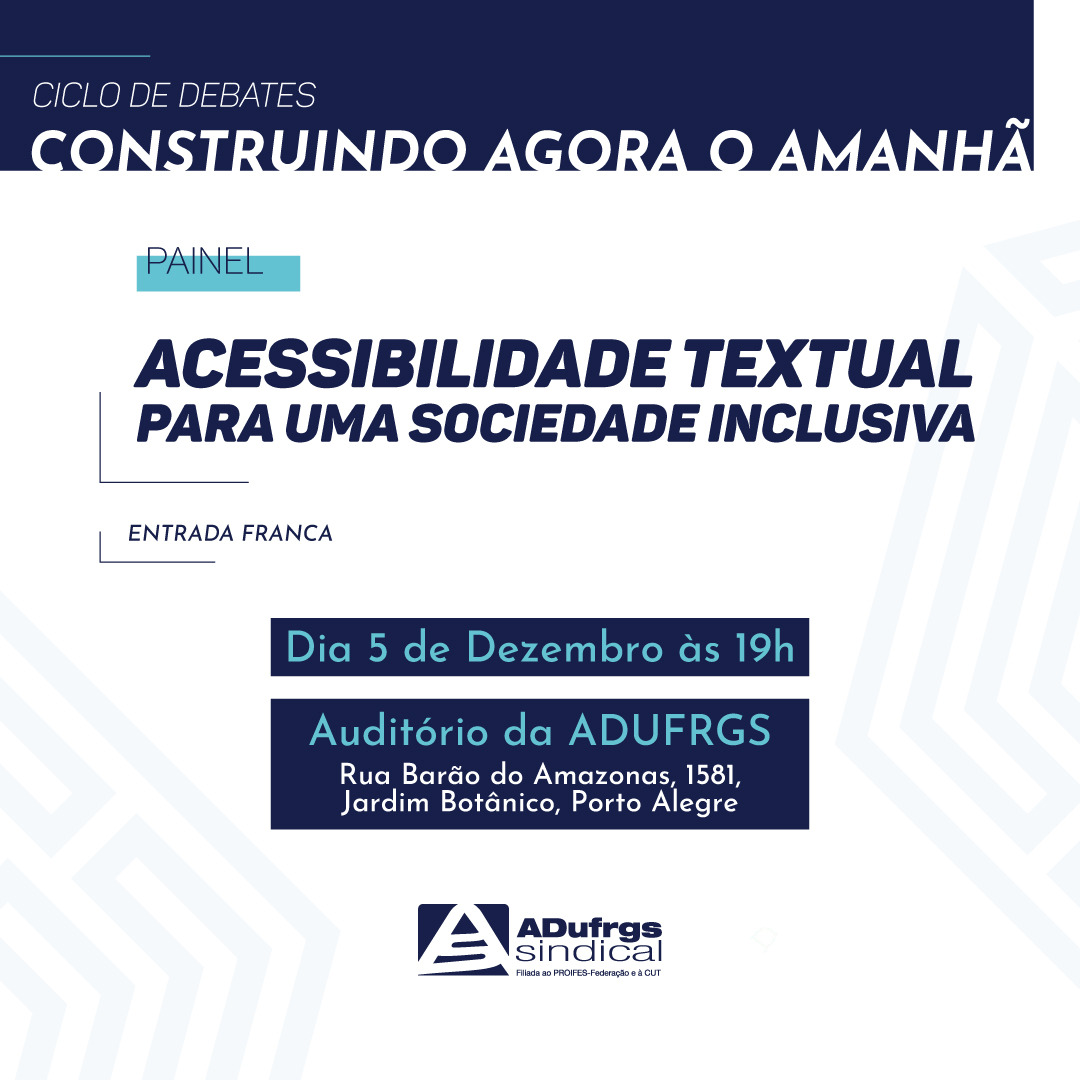 O painel “Acessibilidade textual para uma sociedade inclusiva”, no dia 5 de dezembro, às 19h, será o último da temporada 2024 do ciclo de debates “Construindo agora o amanhã”, promoção da ADUFRGS-Sindical que tem o intuito de inflexionar o debate público na direção da valorização da educação, da democracia e da construção da cidadania. O evento, gratuito e aberto ao público mediante inscrição neste link, ocorre no auditório do Sindicato (rua Barão do Amazonas, 1581, bairro Jardim Botânico) e terá gravação e transmissão ao vivo pela internet, com intérprete de Libras, seguido de sessão de autógrafos.