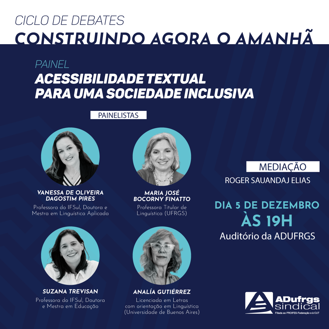 “Acessibilidade textual para uma sociedade inclusiva” será o último painel da temporada 2024 do ciclo de debates “Construindo agora o amanhã”, promoção da ADUFRGS-Sindical que tem o intuito de inflexionar o debate público na direção da valorização da educação, da democracia e da construção da cidadania. O evento, gratuito e aberto ao público mediante inscrição neste link, ocorre na próxima quinta-feira, dia 5 de dezembro, às 19h, no auditório do Sindicato (rua Barão do Amazonas, 1581, bairro Jardim Botânico) e terá gravação e transmissão ao vivo pela internet, com intérprete de Libras, seguido de sessão de autógrafos.
