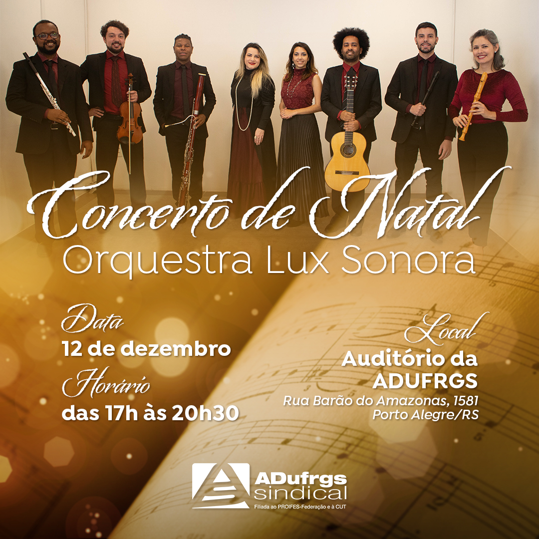 A ADUFRGS-Sindical oferece no dia 12 de dezembro, com entrada franca e aberta à comunidade, concerto de Natal com a orquestra Lux Sonora em sua sede na rua Barão do Amazonas, 1581. A programação tem início às 17h, com feira solidária, seguida de receptivo, e o concerto às 19h, encerrando às 20h30. Gratuitas, as inscrições podem ser feitas até o dia do evento, enquanto houver lugares, por isso o ideal é registrar a presença o quanto antes neste link.