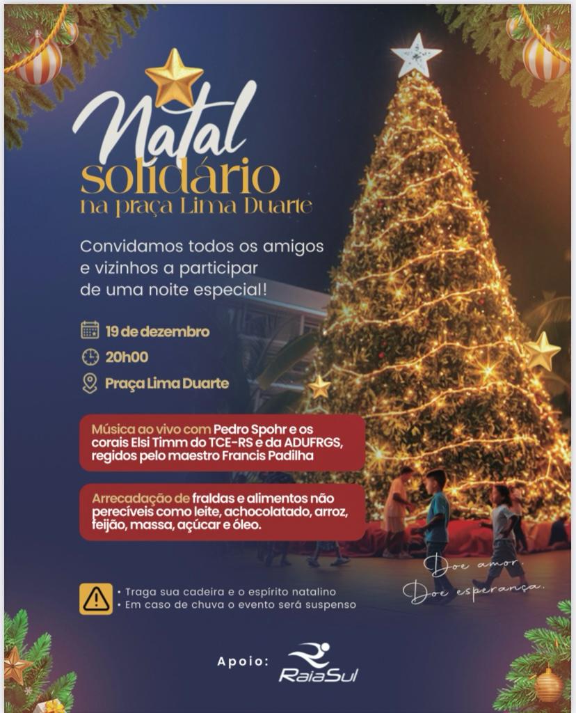 O Coral da ADUFRGS-Sindical participa, na próxima quinta-feira, 19, a partir das 20h, do Natal Solidário na Praça Lima Duarte, bairro Chácara das Pedras, em Porto Alegre. O concerto terá música ao vivo com Pedro Spohr e os corais Elsi Timm, do Tribunal de Contas do Estado do Rio Grande do Sul (TCE-RS), e da ADUFRGS, regidos pelo maestro Francis Padilha. Na ocasião, serão arrecadados fraldas e alimentos não perecíveis, como leite, achocolatado, arroz, feijão, massa, açúcar e óleo. Os participantes são convidados a levarem sua cadeira para a praça. Em caso de chuva o evento será suspenso.
