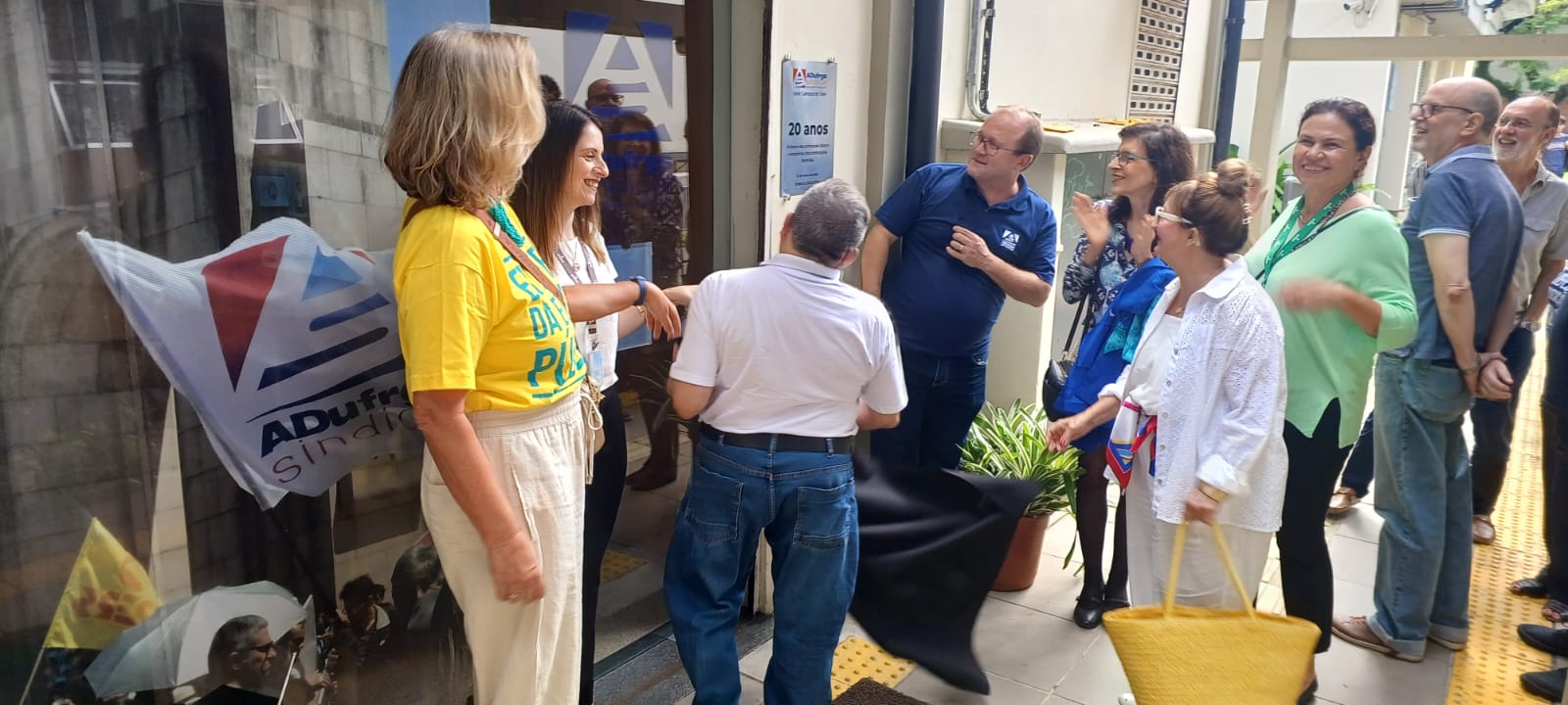 Cercada pela agitação típica de início do ano letivo na UFRGS, a Sede Campus do Vale da ADUFRGS-Sindical comemorou 20 anos de atuação com o descerramento de uma placa alusiva a essa memória. Estiveram presentes na solenidade, a reitora da UFRGS, Márcia Barbosa, a pró-reitora de Graduação da UFRGS, Nadya Pesce da Silveira, o presidente da ADUFRGS-Sindical, Jairo Bolter, a diretora de Comunicação, Ana karin Nunes, a diretora de Secretaria, Regina Witt, a presidente do Conselho de Representantes, Sônia Ogiba, o vice-presidente do CR, Darci Campani e o diretor do Instituto Latino-Americano de Estudos Avançados (ILEA UFRGS), Francisco Marshall, além de docentes, servidores e representantes dos estudantes.